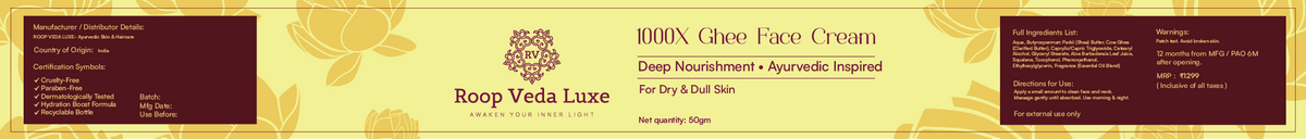 Roop Veda Luxe 1000X Ghee Face Cream is an ayurvedic-inspired rich moisturizer crafted for dry and dull skin. Powered with Cow Ghee, Shea Butter, Aloe Vera, and Squalane, it deeply nourishes, repairs the skin barrier, and restores a healthy natural glow.