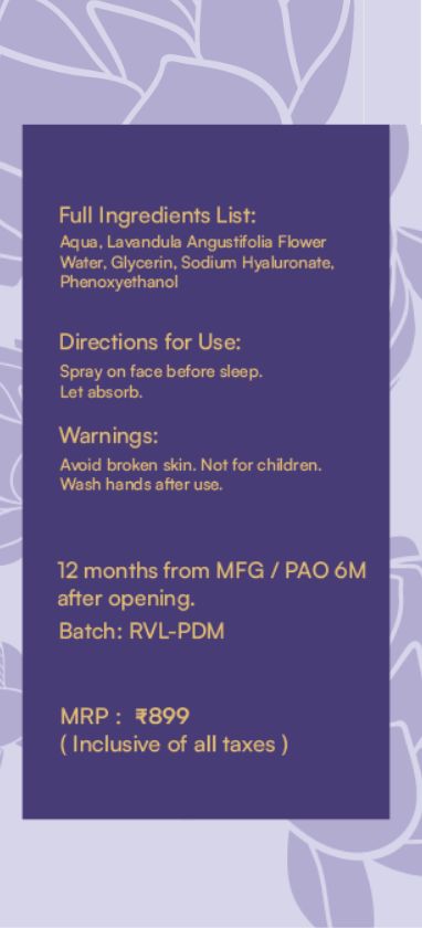 Roop Veda Luxe Lavender Sleep Face Spray is a calming night mist with Lavender Water and Hyaluronic support to relax skin and provide overnight hydration.