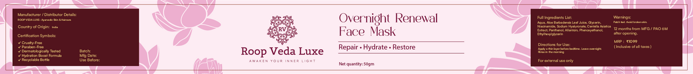 Roop Veda Luxe Overnight Renewal Face Mask is a lightweight gel formula designed to repair, hydrate, and restore skin while you sleep using Niacinamide, Hyaluronic Acid, and Centella extracts.