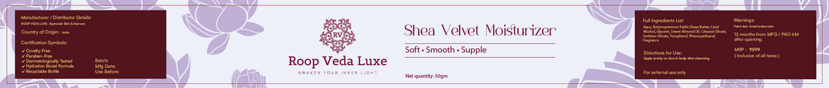 Roop Veda Luxe Shea Velvet Moisturizer delivers deep moisture lock with a non-greasy finish for face and body. Enriched with Shea Butter, Sweet Almond Oil and Vitamin E, it keeps skin soft, smooth, and supple for daily use.