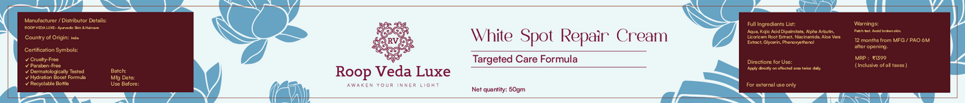Roop Veda Luxe White Spot Repair Cream is a targeted care formula powered with Kojic Dipalmitate, Alpha Arbutin, Licorice and Niacinamide to help improve uneven skin tone with consistent use.